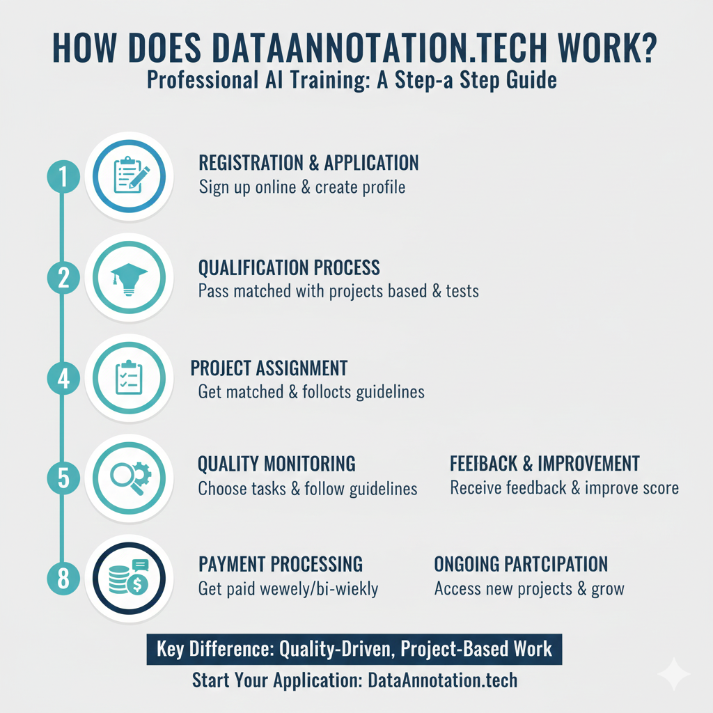 DataAnnotation.tech operates through a project-based system where qualified workers complete tasks according to specific guidelines and quality standards.