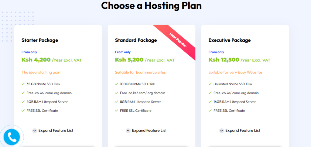 Shared hosting plans start at entry-level price points accessible to individuals and micro-businesses, progressing through mid-tier business plans to higher-tier plans for established websites with greater resource requirements. Pricing is structured to be competitive within the Kenyan market.