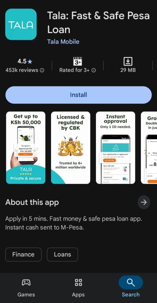 Available on: Android (Google Play Store). iOS availability is limited — check the App Store for your device. Official site: tala.co.ke | SMS support: 21991 | Email: hellokenya@talamobile.com